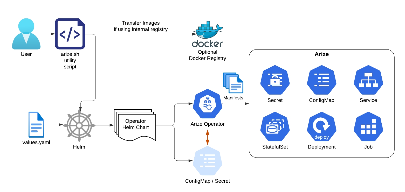 The arize.sh utility script which assists the user in performing some of the tasks like transferring Arize images to an internal Docker registry (if applicable) and calling Helm to deploy the chart. Note that the user can also call Helm directly if preferred.