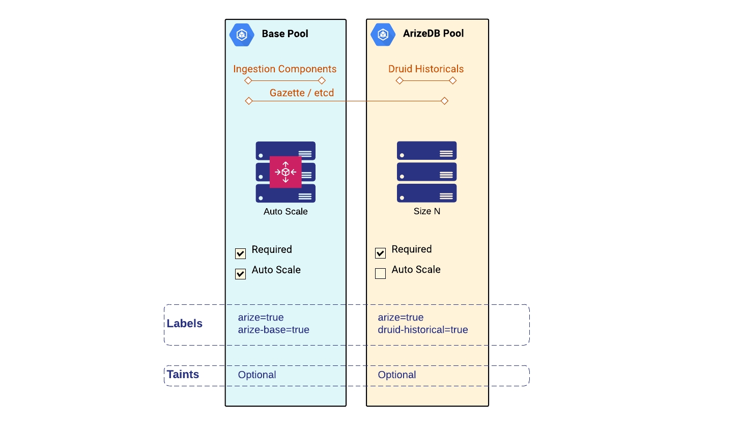 Arize recommends a minimum of two node pools to get started, a Base Pool for basic functions and ingestion components and an ArizeDB Pool for the Historicals which serve the data queried by the Arize UI. If the creation of individual node pools is not an option, Arize can be deployed on a shared set of nodes by specifying historicalNodePoolEnabled: false