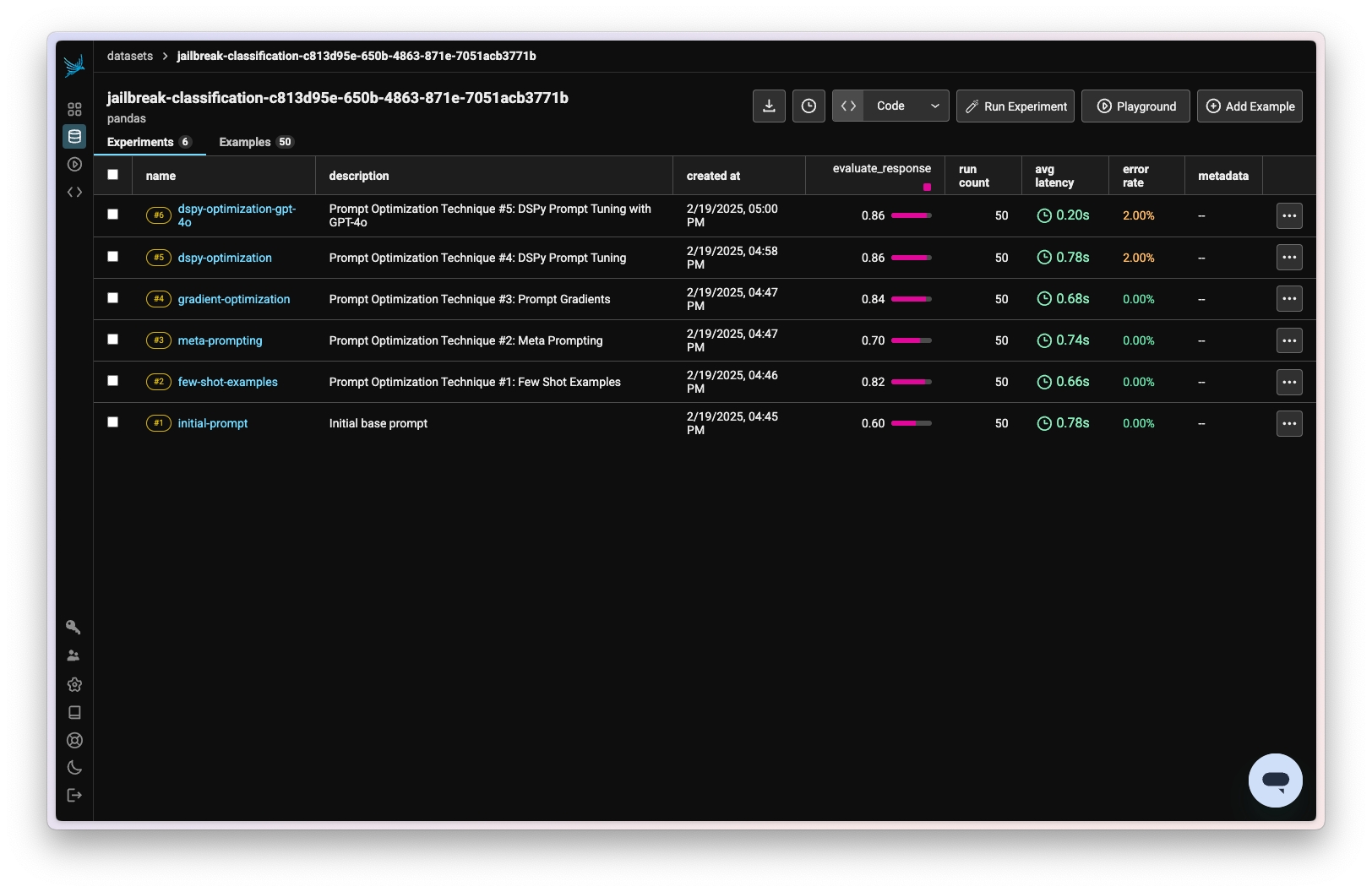 And just like that, you've run a series of prompt optimization techniques to improve the performance of a jailbreak classification task, and compared the results using Phoenix.