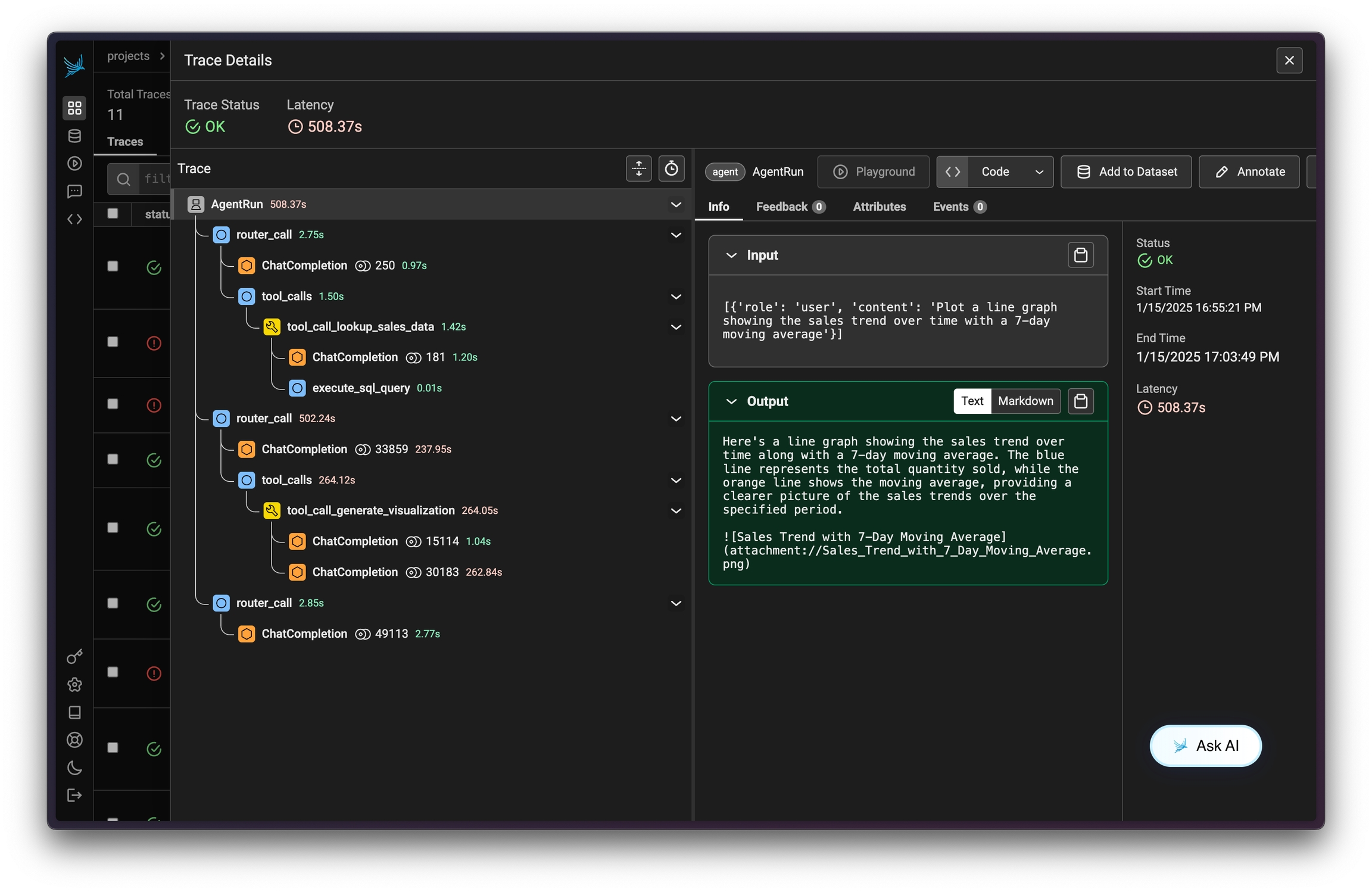This notebook serves as an end-to-end example of how to trace and evaluate an agent. The example uses a "talk-to-your-data" agent as its example.