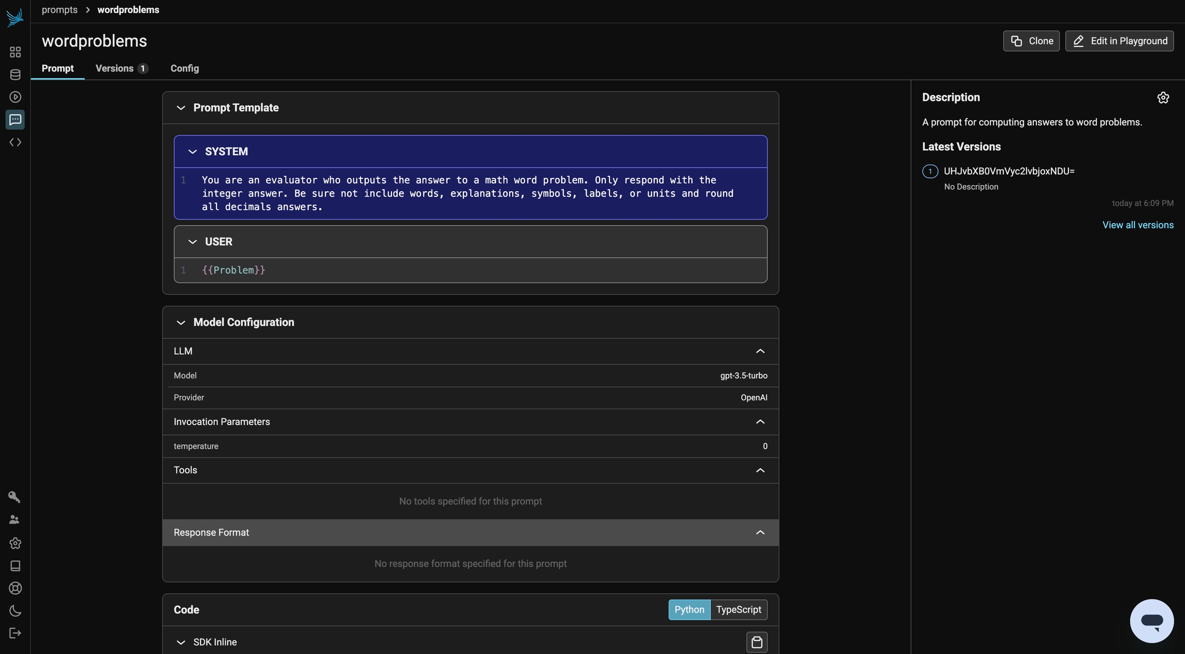 )At this stage, this initial prompt is now available in Phoenix under the Prompt tab. Any modifications made to the prompt moving forward will be tracked under Versions, allowing you to monitor and compare changes over time.