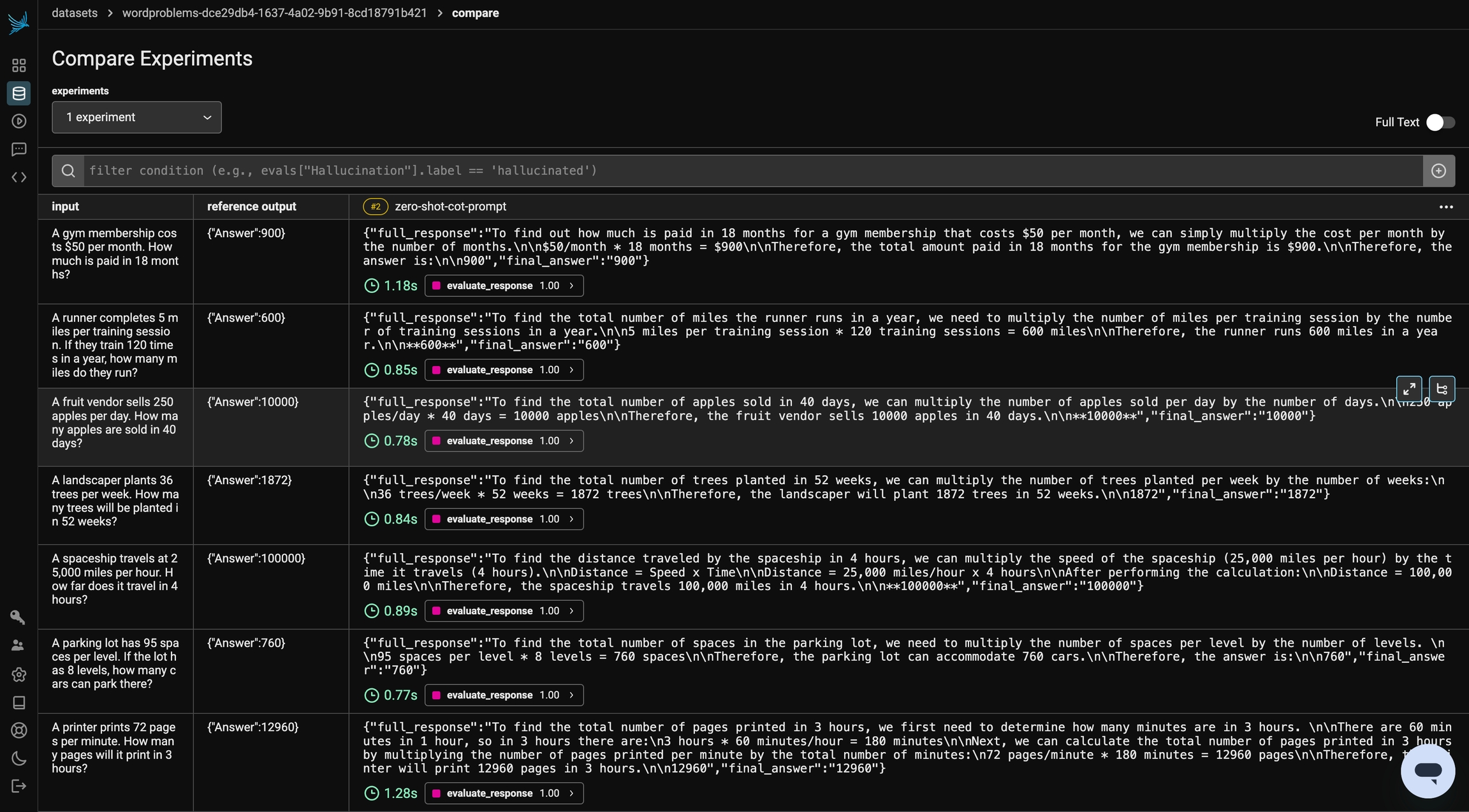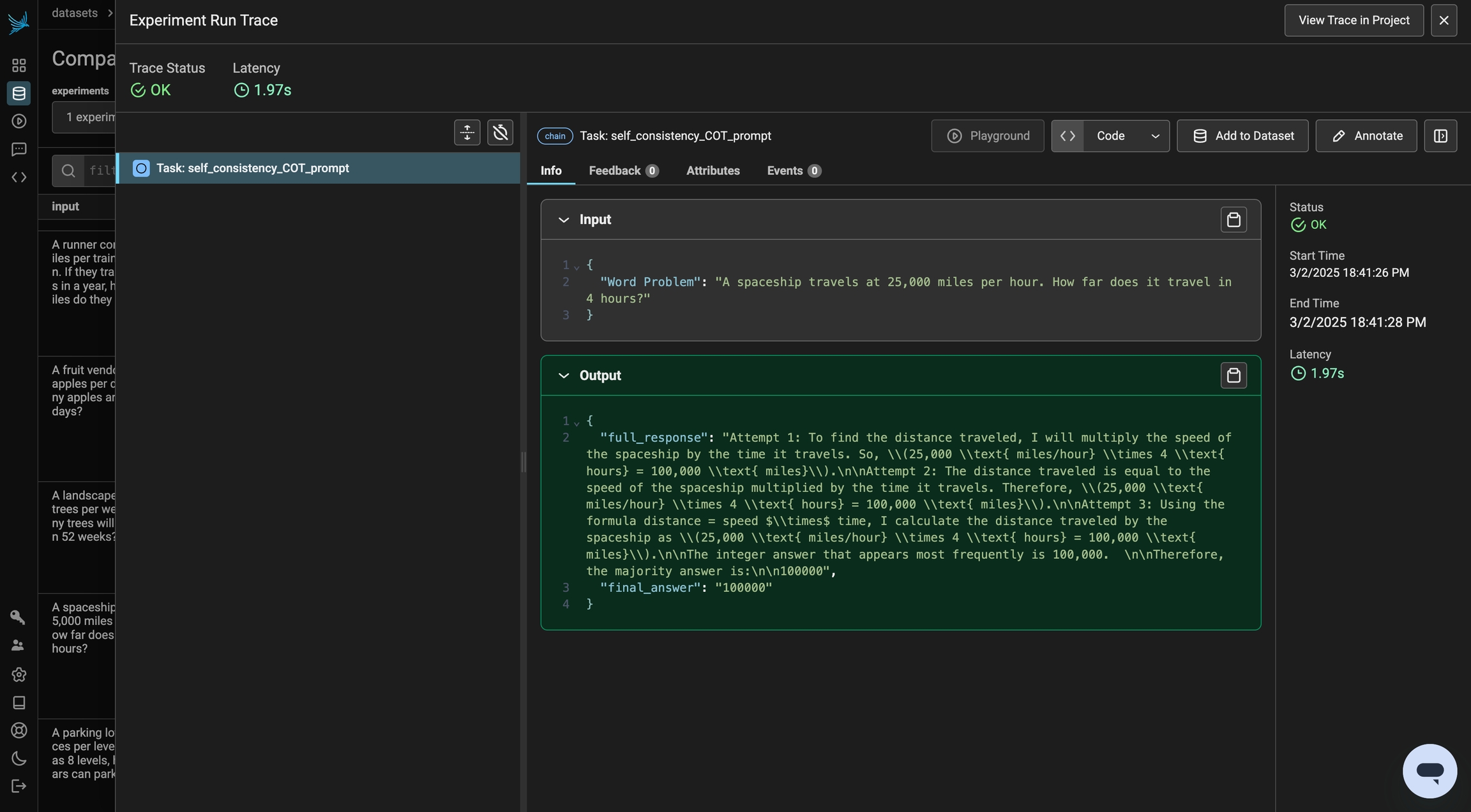 )By clicking into the experiment in Phoenix, you can take a look at the steps the model took the reach the answer. By telling the model to think through the problem and output reasoning, we see a performance improvement.
