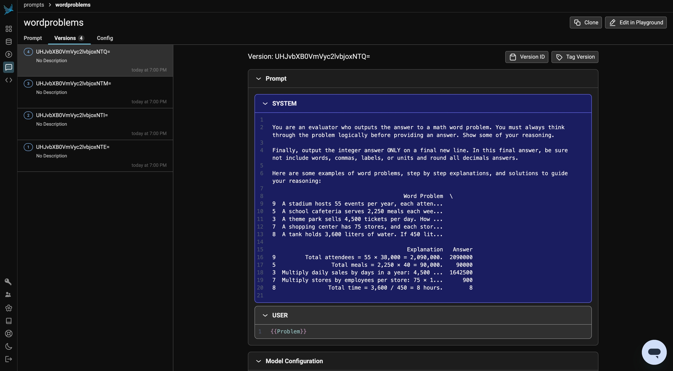 This dataset includes math word problems, step-by-step explanations, and their corresponding answers. As we refine our prompt, we'll test it against the dataset to measure and track improvements in performance.