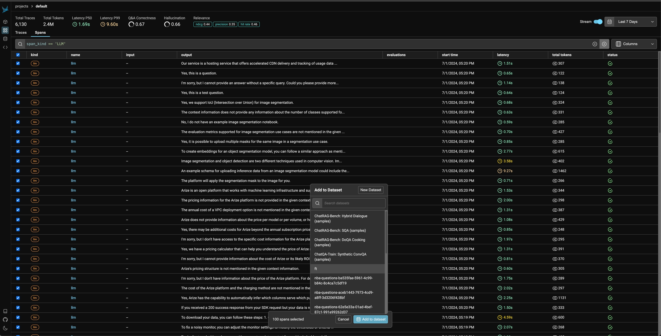 You can also use the filters on the spans table and select multiple spans to add to a specific dataset.