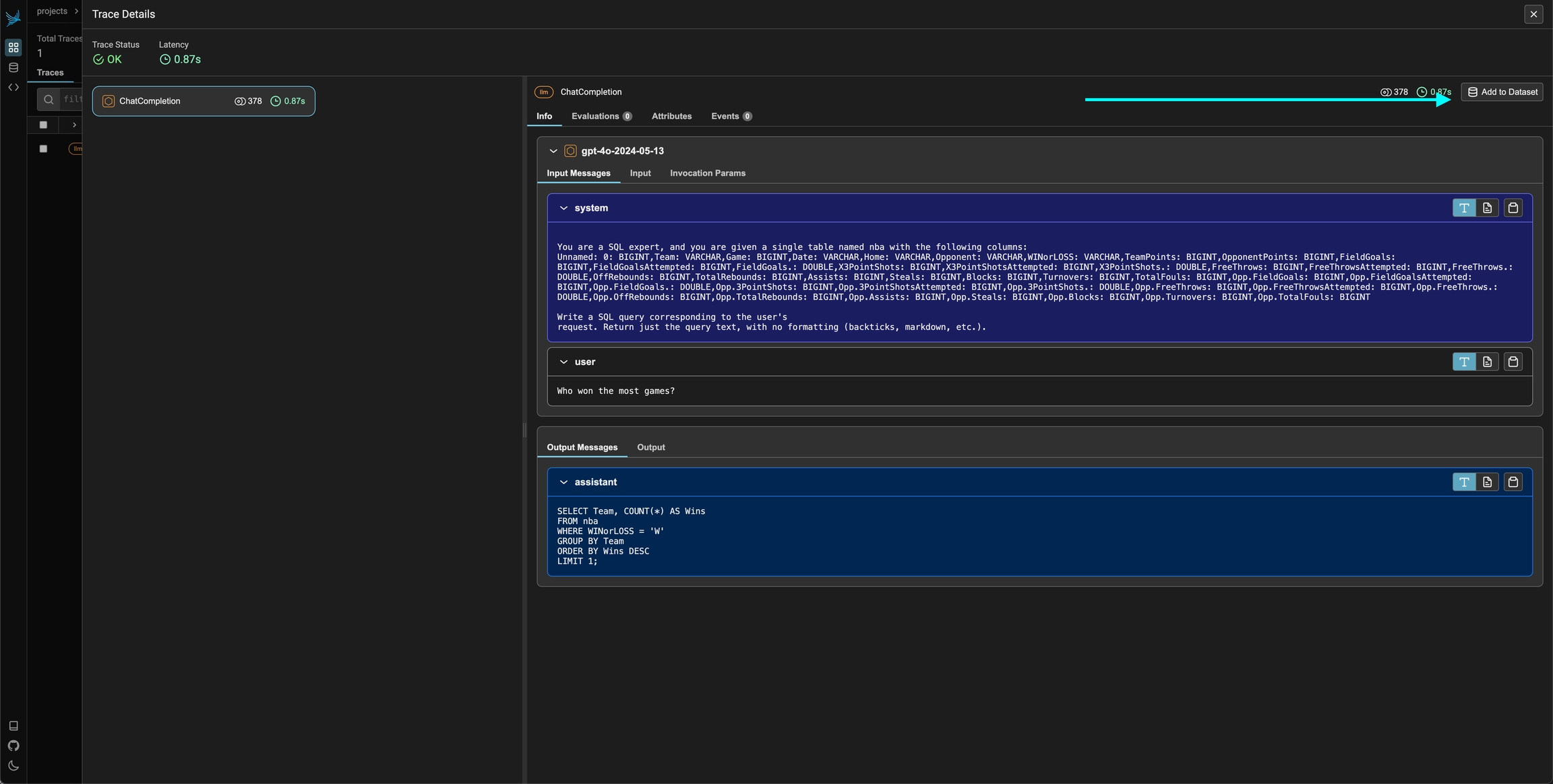 To add a single span to a dataset, simply select the span in the trace details view. You should see an add to dataset button on the top right. From there you can select the dataset you would like to add it to and make any changes you might need to make before saving the example.