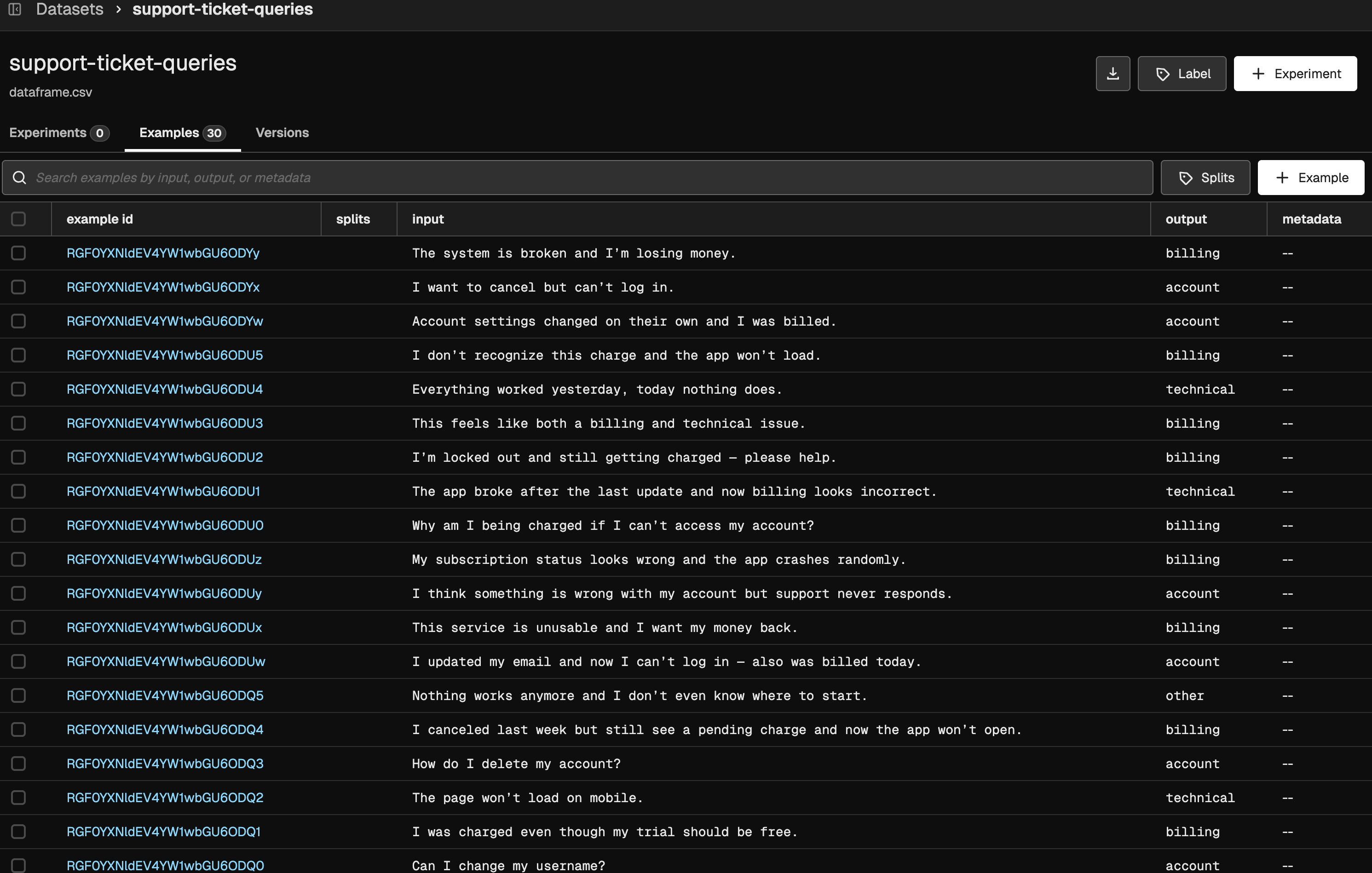 Let’s create our golden dataset and upload it to Phoenix. We’ve constructed 30 examples, each with a reference output in the expected_category field. When uploading, we map query to the input and expected_category to the output.