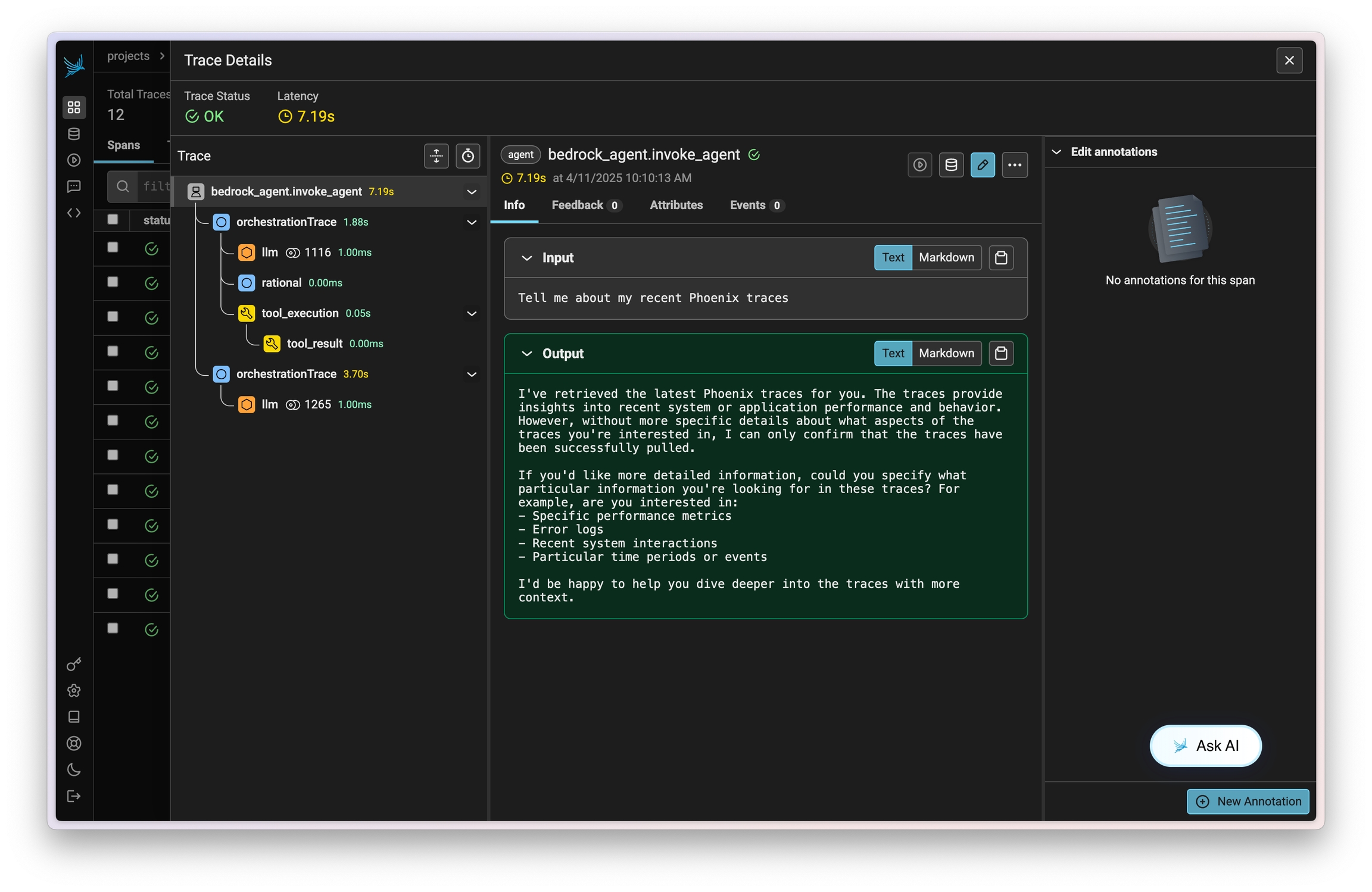 Amazon Bedrock Agents allow you to easily define, deploy, and manage agents on your AWS infrastructure. Traces on invocations of these agents can be captured using OpenInference and viewed in Phoenix.