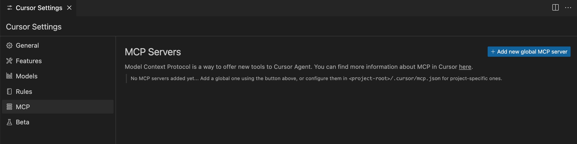 From the Cursor Settings page, navigate to the MCP section, and click "Add new global MCP server"