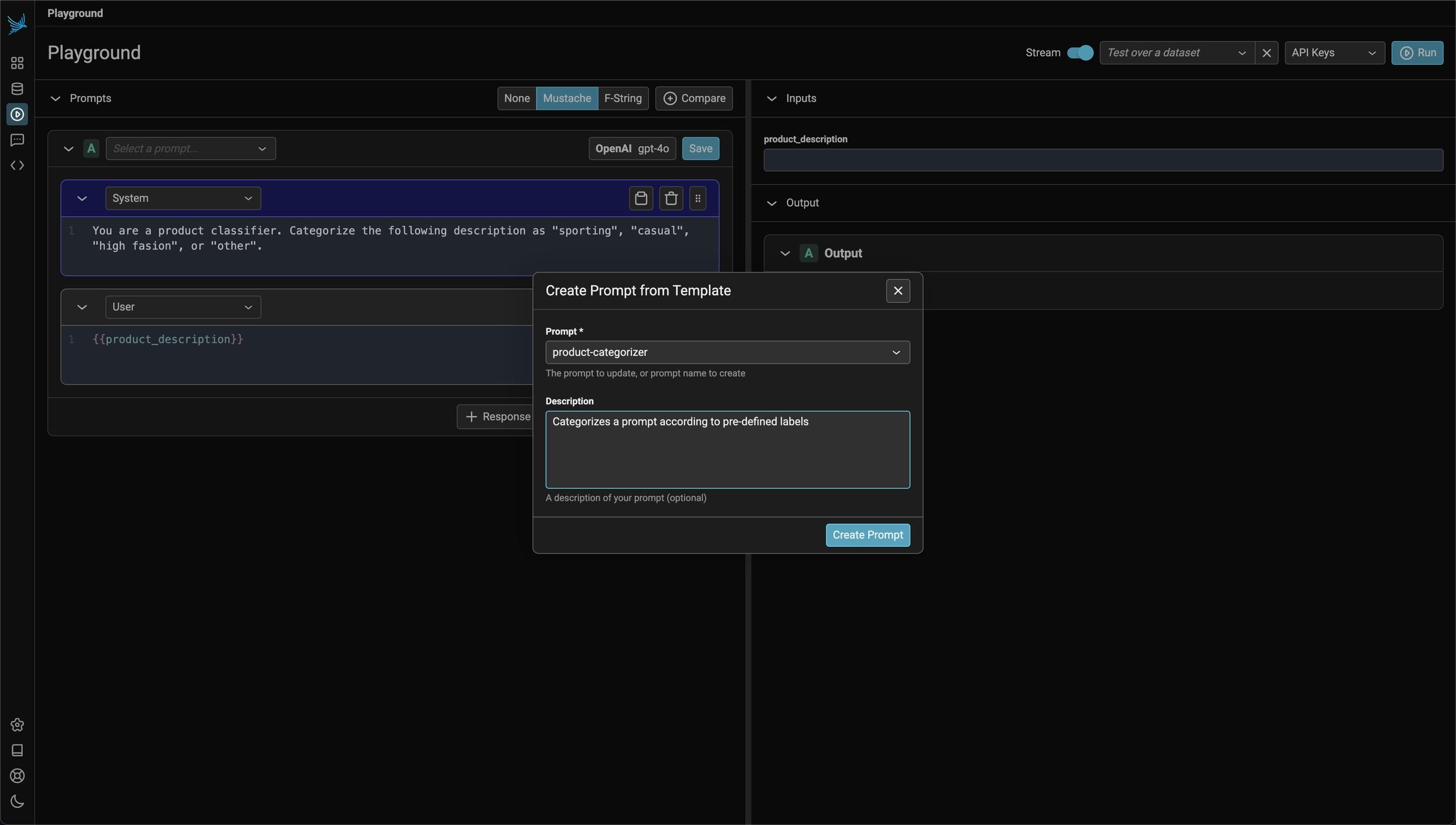 The playground is like the IDE where you will develop your prompt. The prompt section on the right lets you add more messages, change the template format (f-string or mustache), and an output schema (JSON mode).