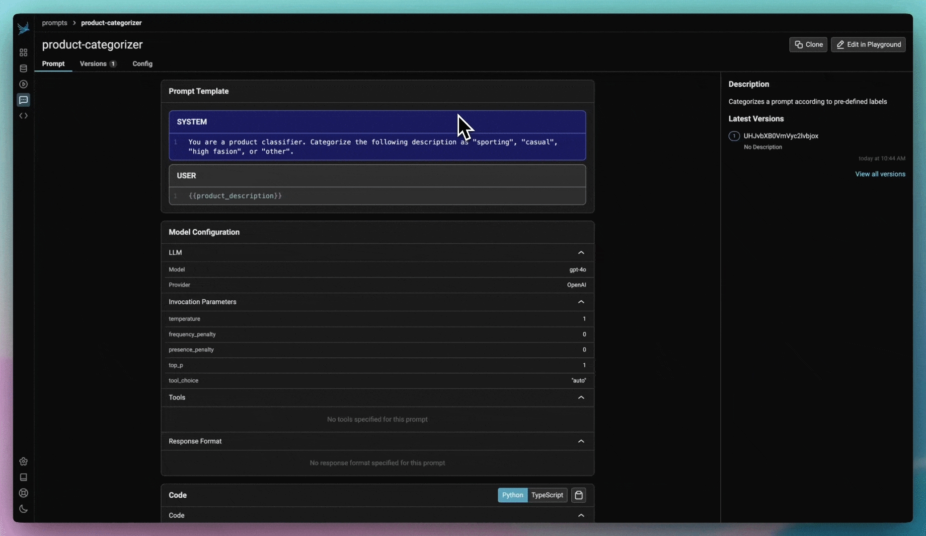 Once you've created a prompt, you probably need to make tweaks over time. The best way to make tweaks to a prompt is using the playground. Depending on how destructive a change you are making you might want to just create a new prompt version or clone the prompt.