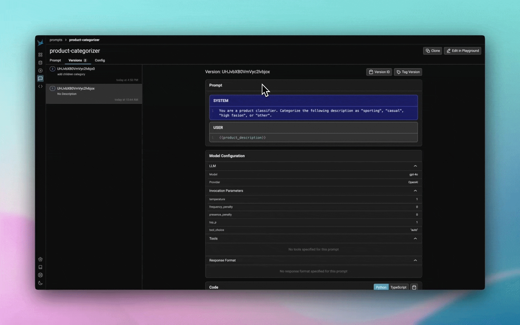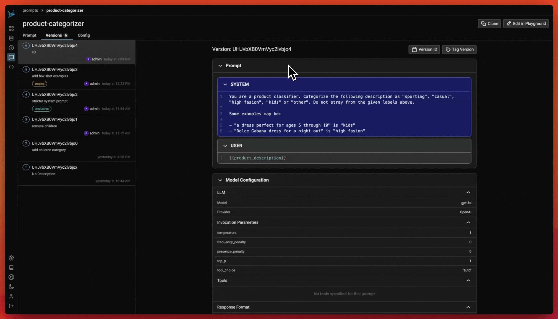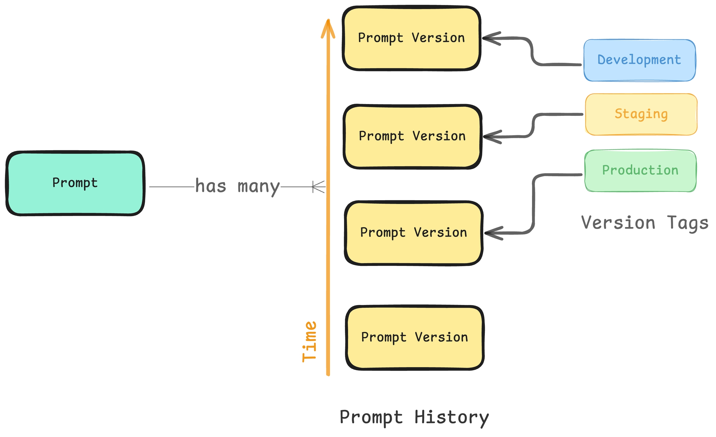 Once a prompt version is tagged, you can pull this version of the prompt into any environment that you would like (an application, an experiment). Similar to git tags, prompt version tags let you create a "release" of a prompt (e.x. pushing a prompt to staging).
