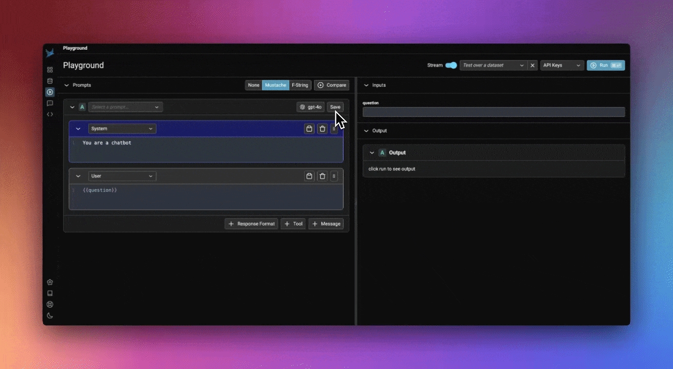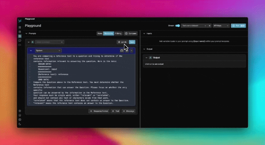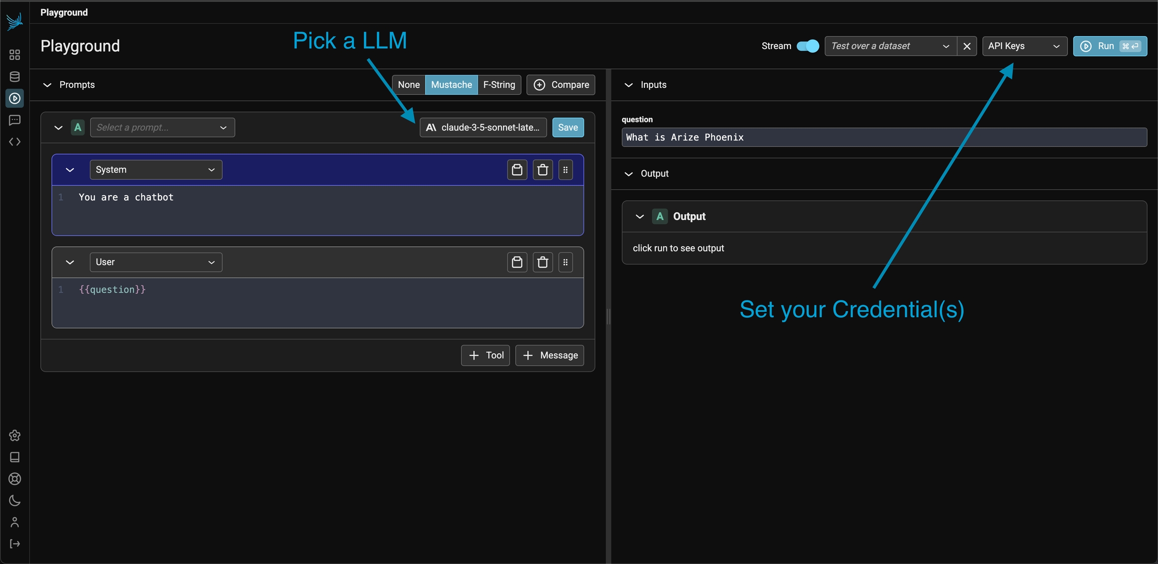 To first get started, you will first Configure AI Providers. In the playground view, create a valid prompt for the LLM and click Run on the top right (or the mod + enter