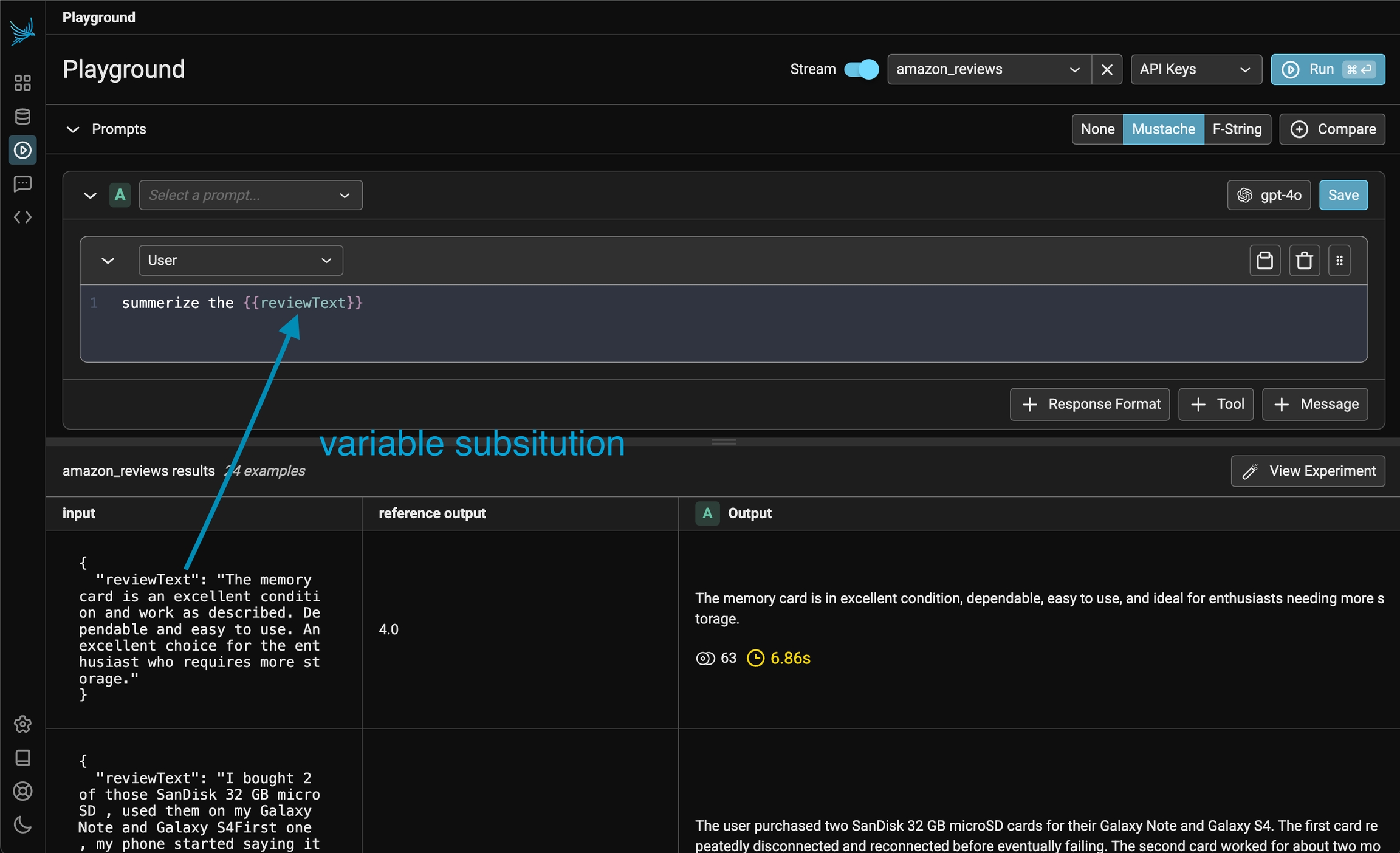 The prompt editor (typically on the left side of the screen) is where you define the . You select the template language (mustache or f-string) on the toolbar. Whenever you type a variable placeholder in the prompt (say {{question}} for mustache), the variable to fill will show up in the inputs section. Input variables must either be filled in by hand or can be filled in via a dataset (where each row has key / value pairs for the input).