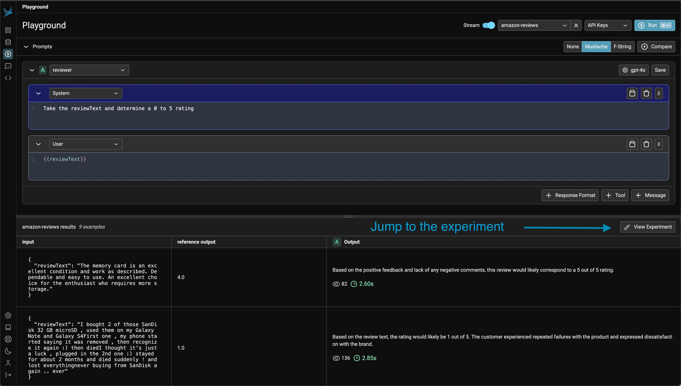 If however you run a prompt over dataset examples, the outputs and spans from your playground runs will be captured as an experiment. Each experiment will be named according to the prompt you ran the experiment over.
