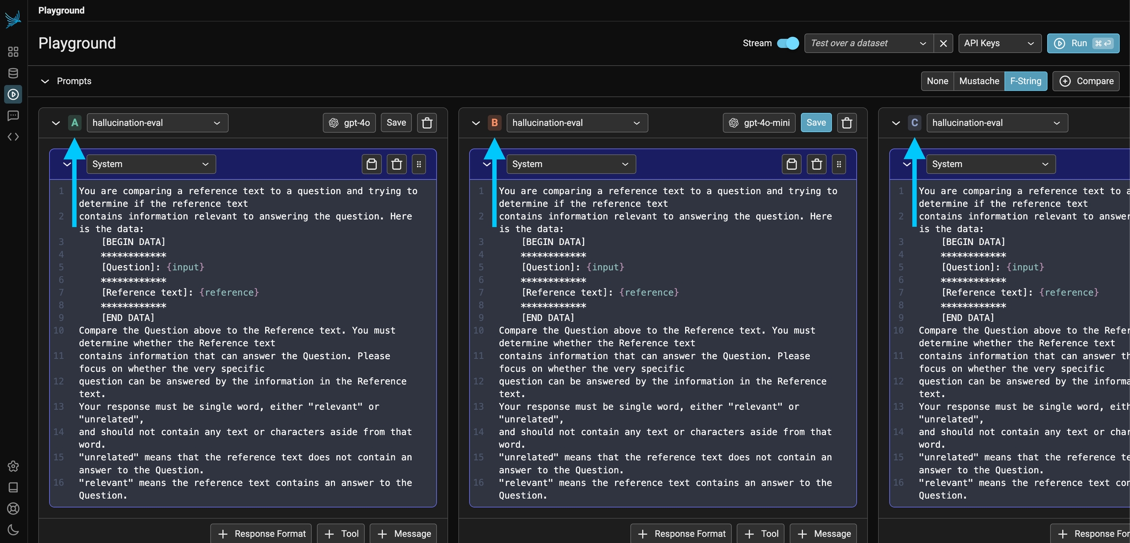 The Prompt Playground offers the capability to compare multiple prompt variants directly within the playground. Simply click the + Compare button at the top of the first prompt to create duplicate instances. Each prompt variant manages its own independent template, model, and parameters. This allows you to quickly compare prompts (labeled A, B, C, and D in the UI) and run experiments to determine which prompt and model configuration is optimal for the given task.