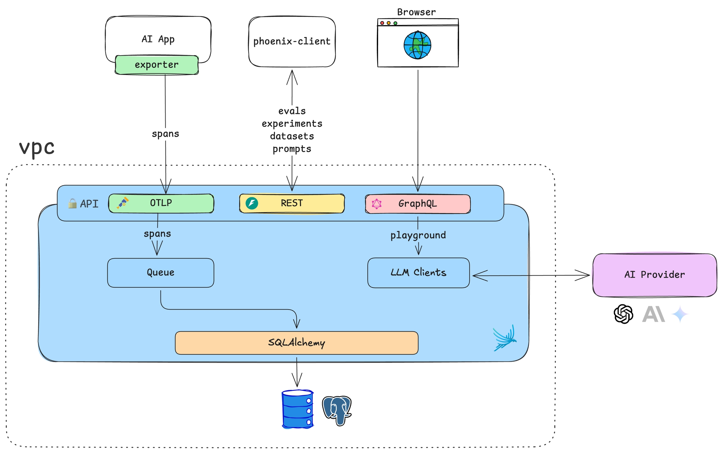 Phoenix is a containerized application designed to collect and analyze traces from your LLM or AI application. It operates with a SQL database backend and provides a robust tracing UI. By default, Phoenix uses SQLite for storage, but it can be configured to use PostgreSQL for production deployments.