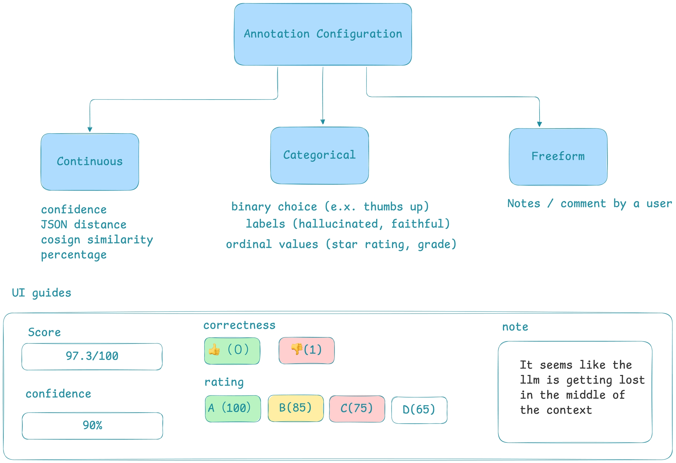 Annotation type: - Categorical: Predefined labels for selection. (e.x. 👍 or 👎) - Continuous: a score across a specified range. (e.g. confidence score 0-100) - Freeform: Open-ended text comments. (e.g. "correct")