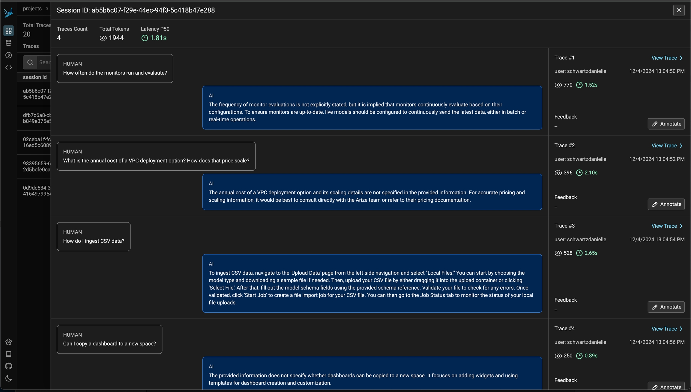 You can then click into a given session. This will open the history of a particular session. If the sessions contain input / output, you will see a chatbot-like UI where you can see the a history of inputs and outputs.