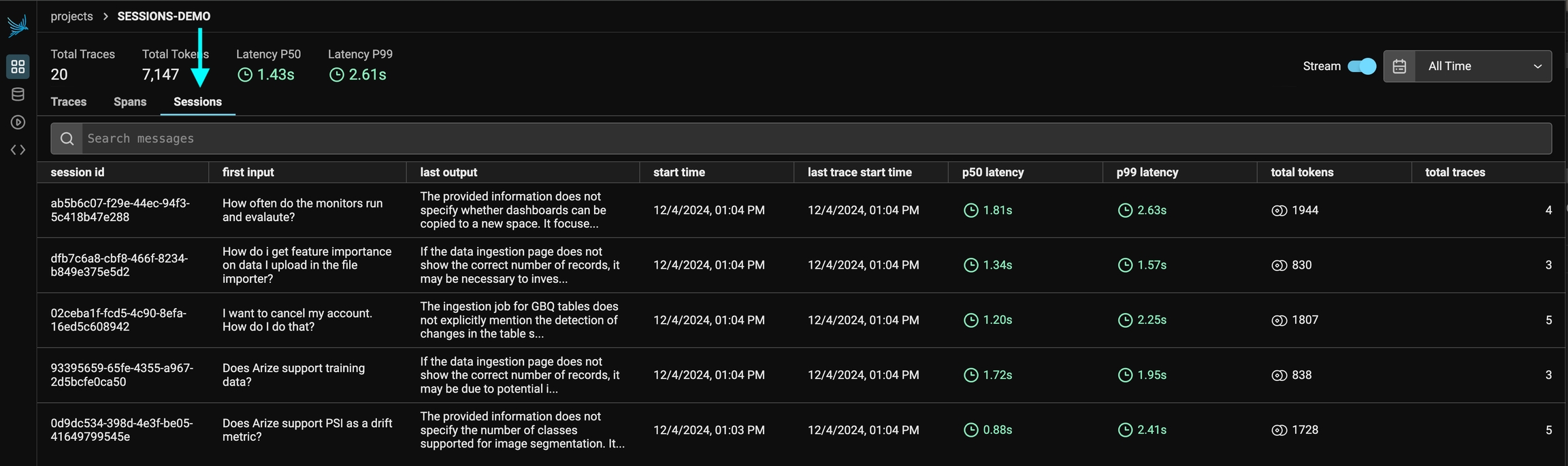 You can view the sessions for a given project by clicking on the "Sessions" tab in the project. You will see a list of all the recent sessions as well as some analytics. You can search the content of the messages to narrow down the list.