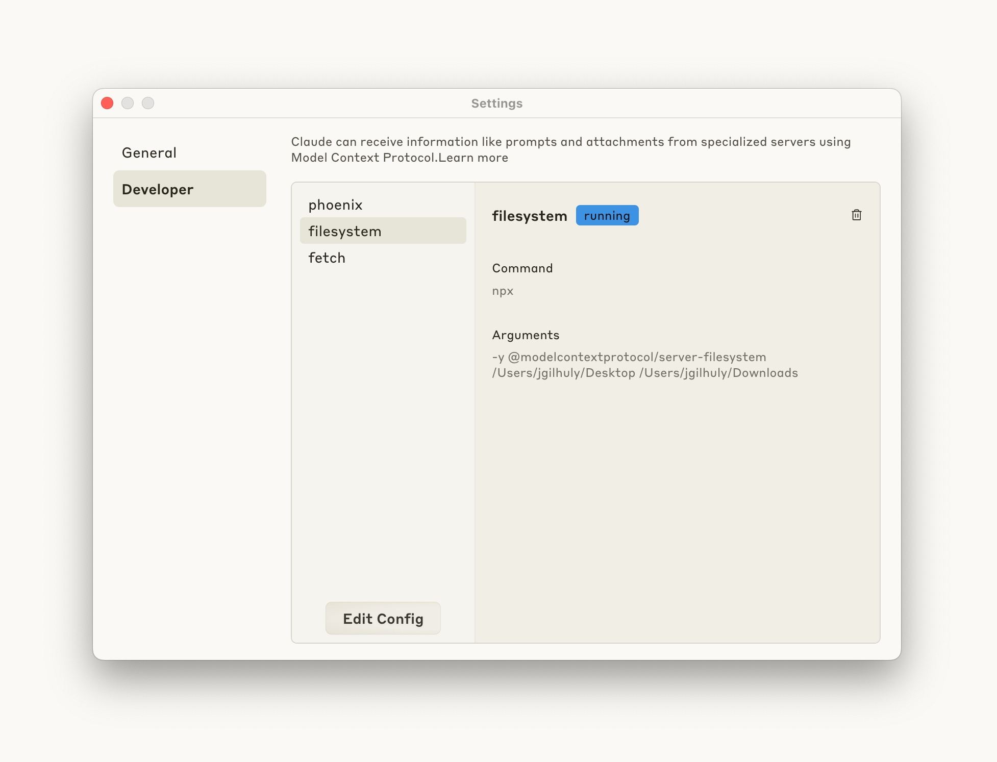 From the Claude Desktop settings window, navigate to the Developer Section, and click "Edit Config"