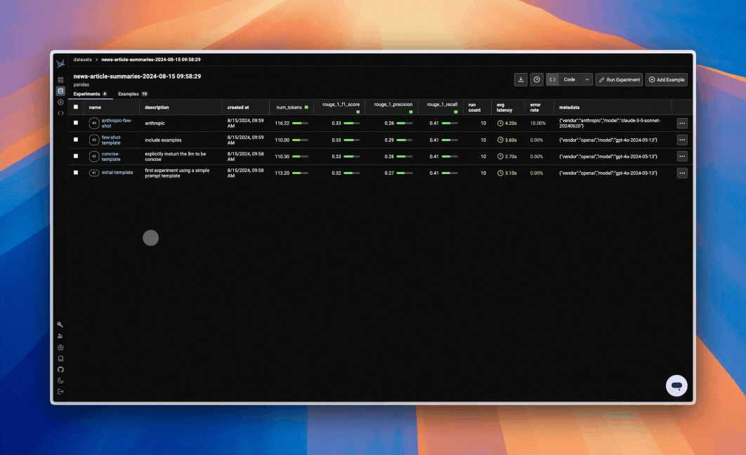 With a stable set of test cases and evaluations defined, you can now easily iterate on your application and view performance changes in Phoenix right away. Swap out models, prompts, or pipeline logic, and run your experiment to immediately see the impact on performance.